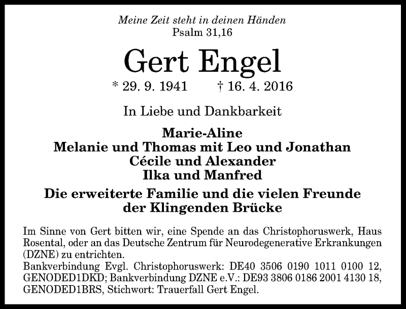 Gert Engel, ein lieber Freund und bemerkenswerter Mann, der jahrzehntelang das Wirken und die Geschicke der Klingenden Brücke als Vorsitzender (1981-2013) der Gesellschaft der Klingenden Brücke e.V. entscheidend mitprägte und 2007 für sein großes Engagement mit dem Verdienstkreuz der Bundesrepublik Deutschland ausgezeichnet wurde, verstarb am 16. April 2016 im Alter von 74 Jahren.